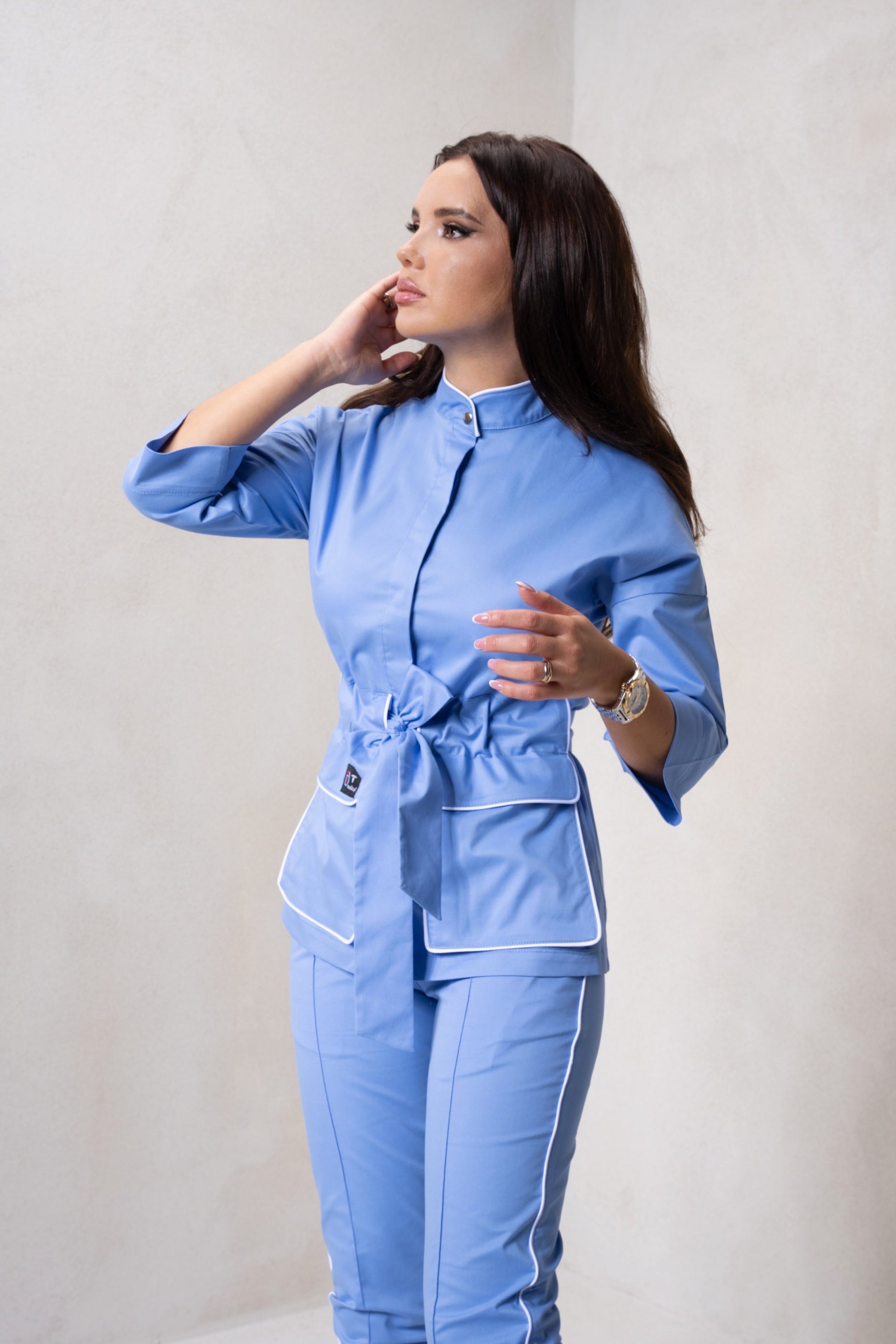 Acest costum medical din materiale stretch, prezentat într-o nuanță elegantă de baby blue, combină perfect funcționalitatea cu un design sofisticat și modern.
