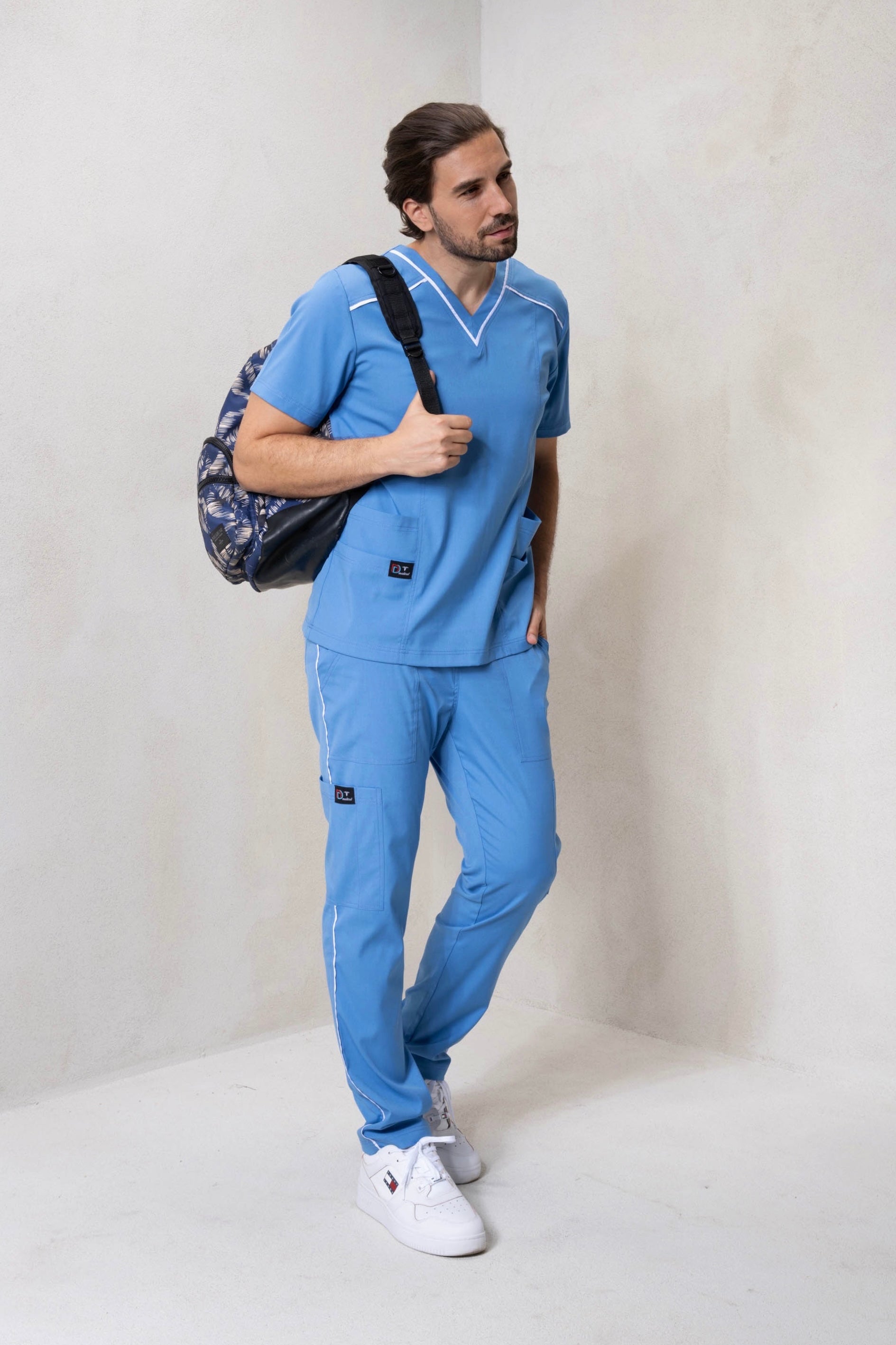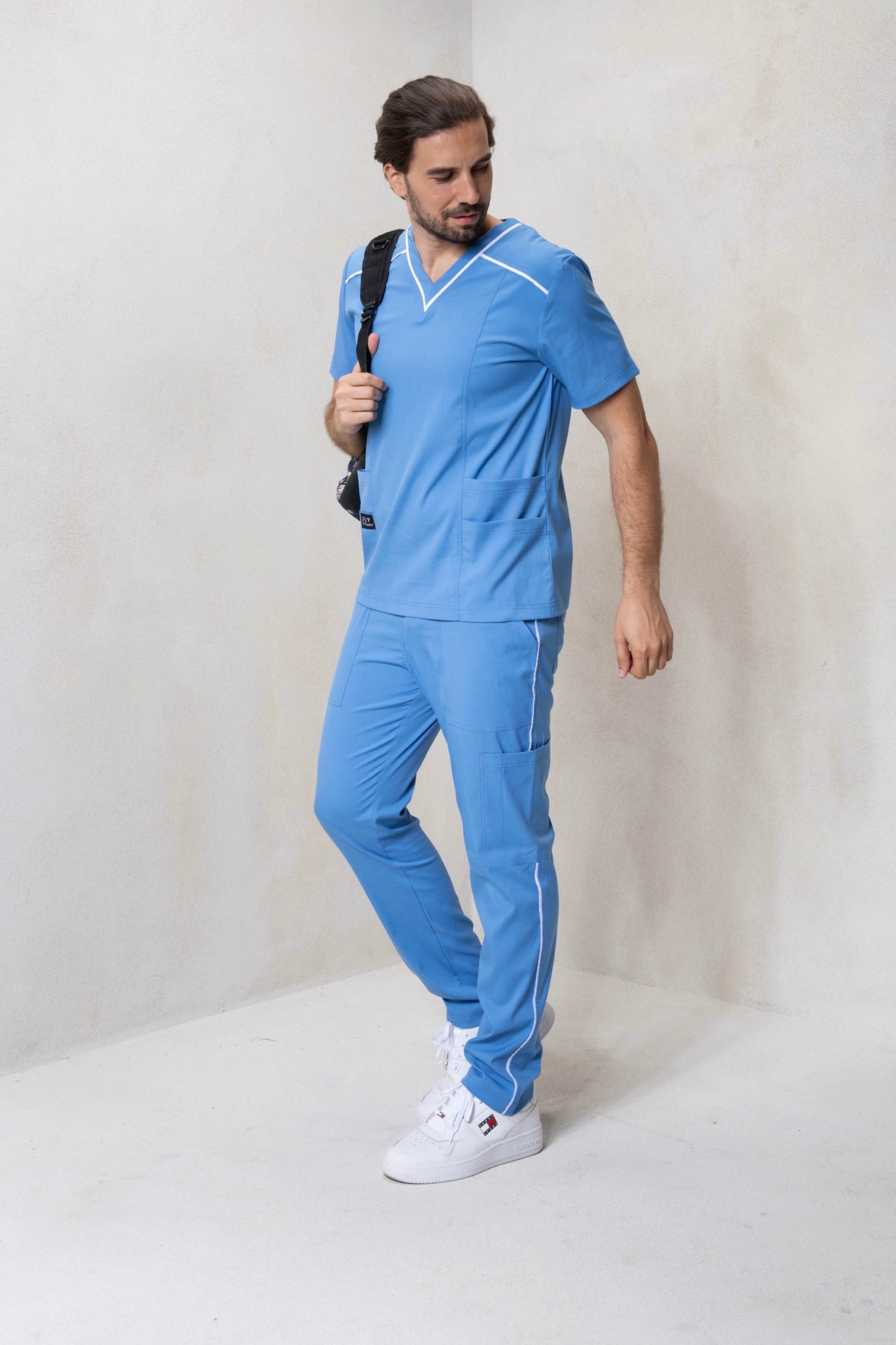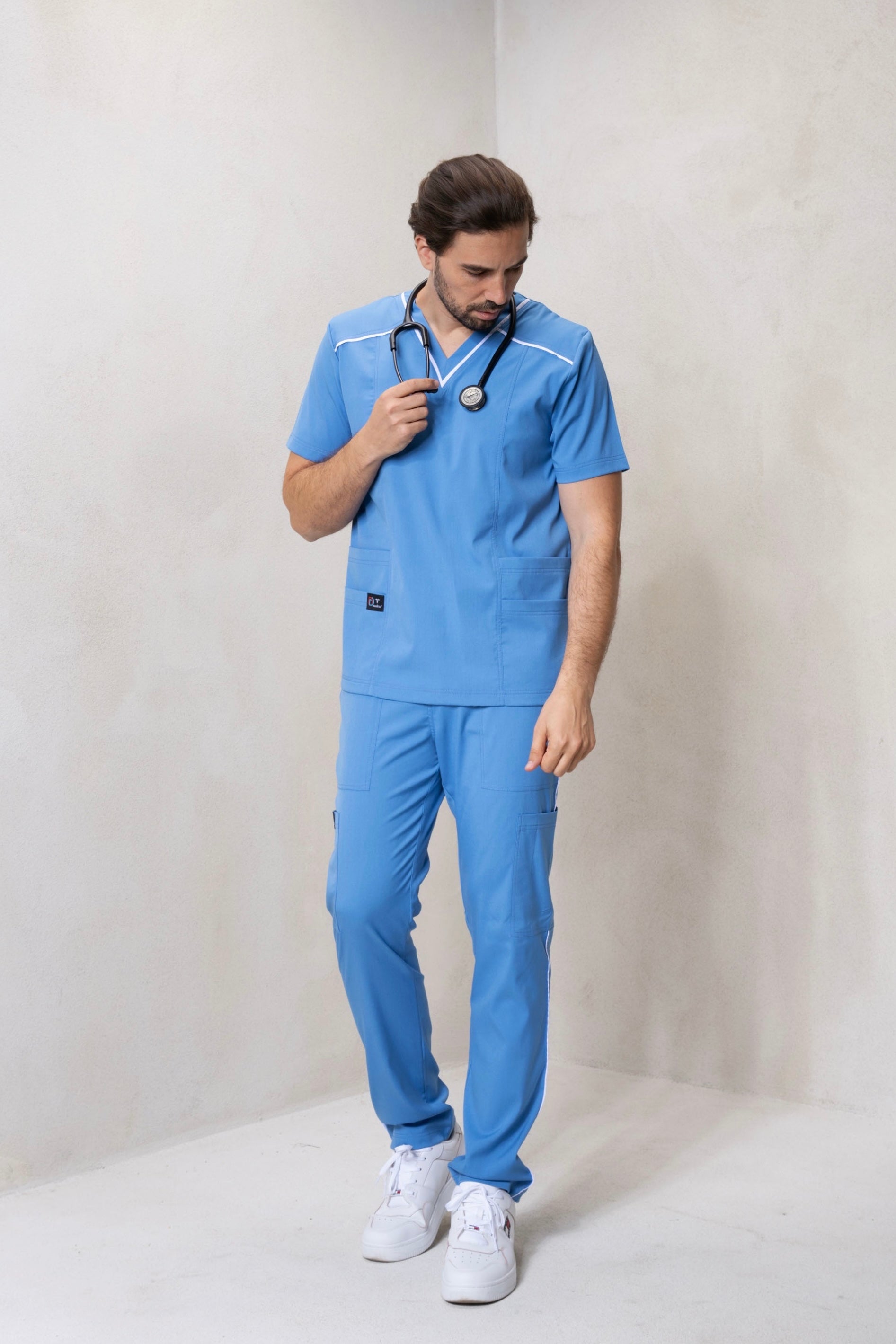 Acest costum medical din materiale stretch, în nuanța albastru deschis, este proiectat pentru a oferi confort, funcționalitate și un aspect modern personalului medical.