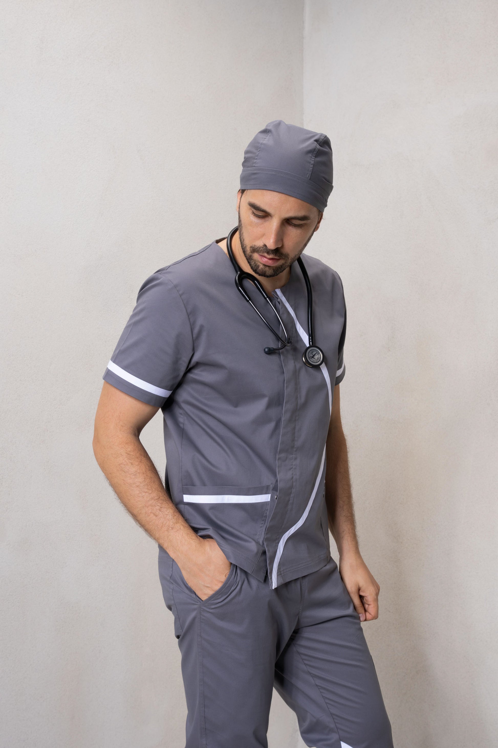 Această uniformă medicală pentru bărbați este confecționată din materiale premium, de înaltă calitate, cu proprietăți stretch, oferind confort și libertate de mișcare de-a lungul întregii zile.