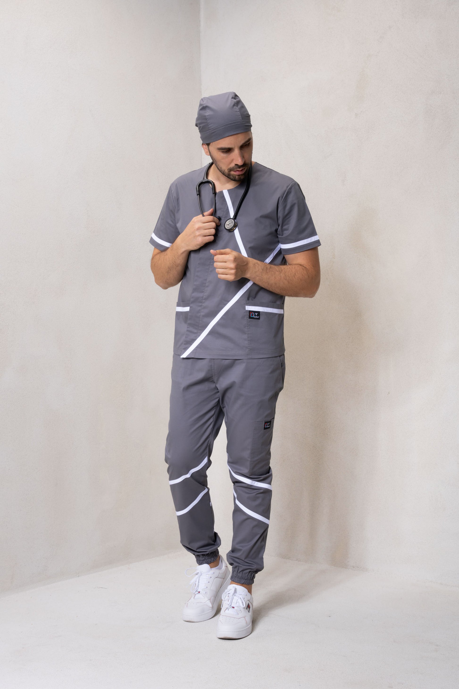 Costumul medical include o bluză cu tăieturi asimetrice și detalii albe contrastante, care adaugă un aspect elegant și profesional.